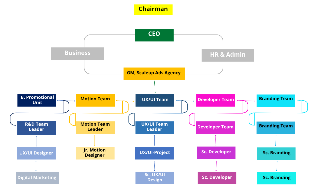 Scaleup Ads Agency operates under a robust and visionary leadership framework, comprising the Chairman, Chief Executive Officer (CEO), Business Consultant, Human Resources and Administration (HR/Admin) Lead, and General Manager. This cohesive leadership structure drives the agency’s strategic direction, fostering innovation and sustainable growth.